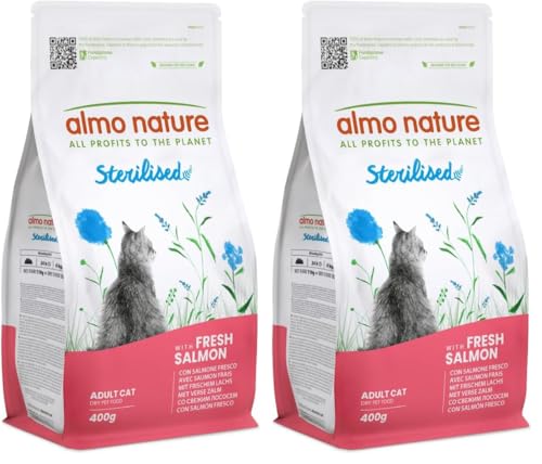 Almo Nature Sterilised - Croquettes pour Chat Stérilisé au Saumon Frais - À Faible Teneur en Magnésium et avec des Fibres pour Le Contrôle du Poids - Sac de 400g (Lot de 2)