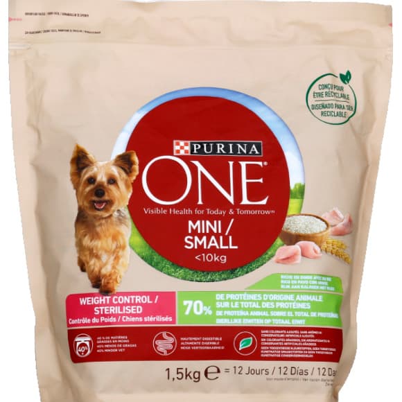 PURINA ONE | MINI | CONTRÔLE DU POIDS | Croquettes pour Chien Adulte de Petite Taille Peu Actif ou en Surpoids, <10 Kg | Faible en matières grasses | A la Dinde | Sac | Lot de 6 x 1,5 Kg