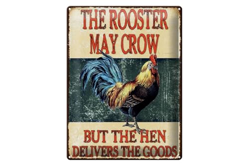 Femer Plaque en tôle avec inscription en allemand « The rooster may crow but the hen delivers » - 30 x 40 cm