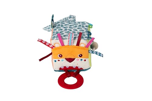 Lilliputiens - Cube d'éveil multi-activités Jack le Lion - Jouet interactif en tissu avec miroir, anneau de dentition et sons - Stimule la motricité et la vue - 8cm - Pour bébés dès 3 mois - 83123