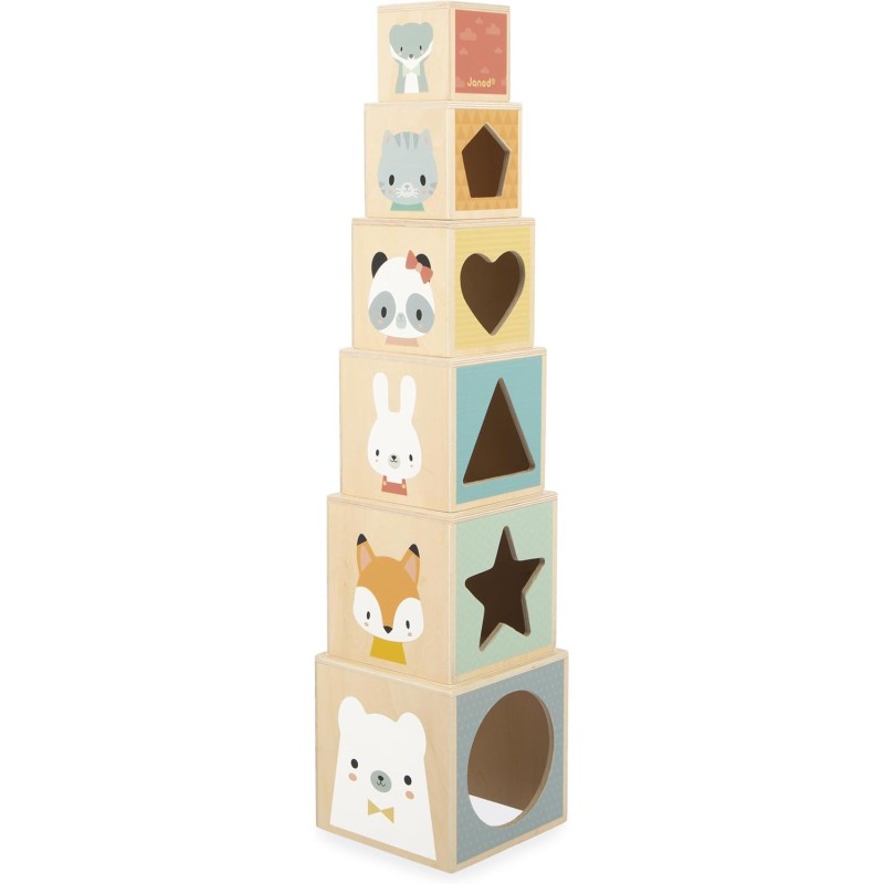 Janod - Ma Première Pyramide - Thèmes éducatifs : Animaux, Fruits, Chiffres, Saisons - Jouet d'Éveil - 10 Cubes à Empiler - Développe Dextérité et Imagination - Dès 12 Mois