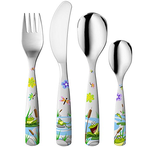 Gnali & Zani Lot de 4 couverts « grenouilles » pour enfant - 1 couteau, 1 fourchette, 1 cuillère à soupe et 1 cuillère à café - Acier inoxydable - Passe au lave-vaisselle - Couverts pour enfants à