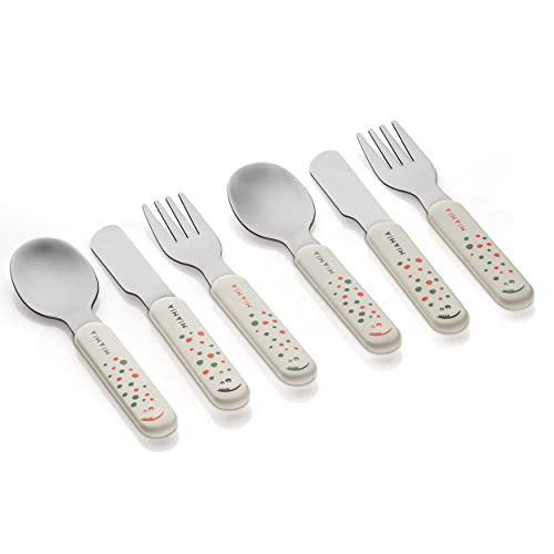 MiaMia Lot de Couvert Bébé 6 Pièces (2x Cuillère, 2x Fourchette, 2x Couteau) - Sûr, Testé, Inox Alimentaire, Forme Arrondie, Manches Épais - Blanc Cassé à Motifs