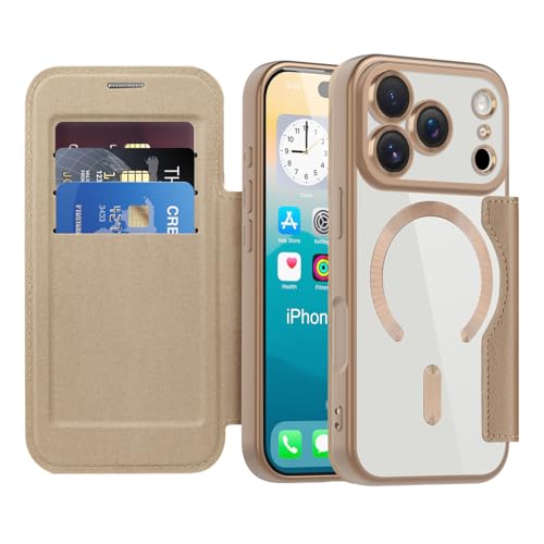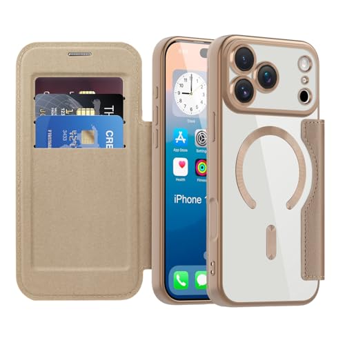 FFXCXL Coque Magnétique pour iPhone17 Pro Compatible avec MagSafe,Étui en Cuir PU Flip Portefeuille avec Emplacement pour Carte,Résistant aux Chutes et aux Rayures, Transparente, doré