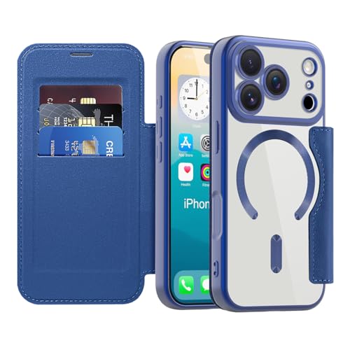FFXCXL Coque Magnétique pour iPhone17 Pro Compatible avec MagSafe,Étui en Cuir PU Flip Portefeuille avec Emplacement pour Carte,Résistant aux Chutes et aux Rayures, Transparente, Blue