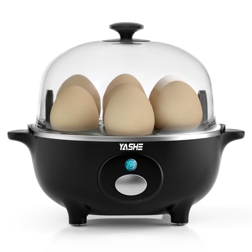 YASHE Cuiseur Oeuf, cuisinier d'œufs de 360 W, 7 œufs faciles à peler, œufs mollets, œufs moyens, œufs durs, poached, maker d'omelette, cuiseur vapeur, buzzer, lumière indicatrice, sans BPA