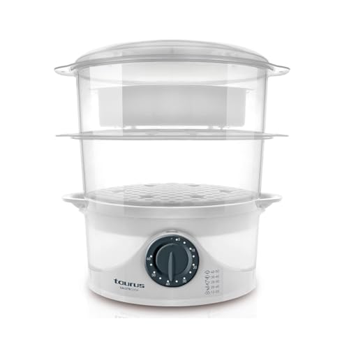 Taurus Salutecook - Cuiseur vapeur 800W, 6L, 3 niveaux de cuisson, Minuterie de 1h, Capacité d'eau de 1L, Accessoire de cuisson du riz, Blanc