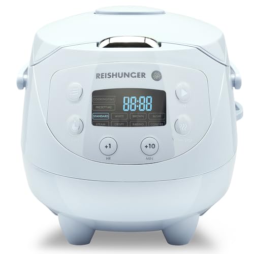 REISHUNGER Mini cuiseur à riz et vapeur japonais bleu clair avec fonction maintien au chaud et bol en céramique, cuillère et verre doseur inclus - 0.6 l pour 1-3 personnes