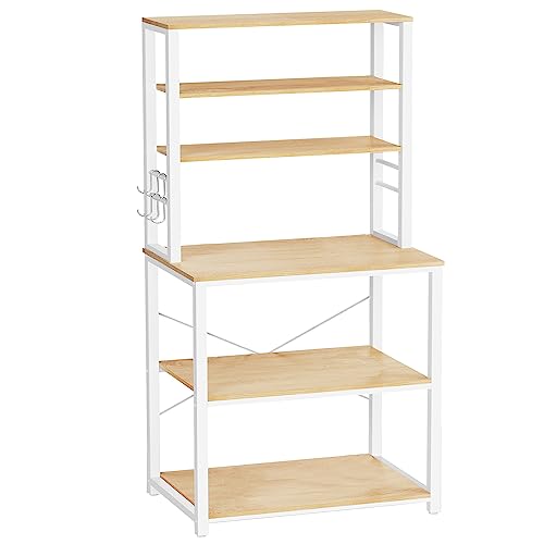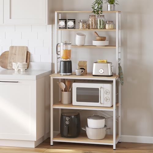 VASAGLE Étagère de Cuisine, Étagère pour Machine à Café, 6 Étagères et 6 Crochets, pour Four à Micro-Ondes, Cadre en Acier, Style Industriel, 40 x 80 x 167 cm, Couleur Chêne et Blanc KKS019W09