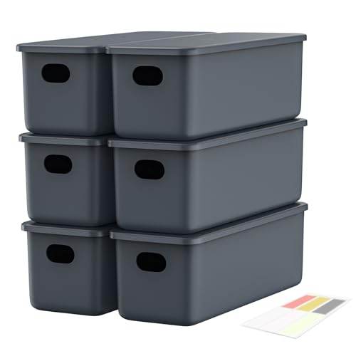 johgee Lot de 6 boîtes de rangement en plastique avec couvercle - Avec poignées - Avec autocollants - Pour cuisine, étagère, armoire, salle de bain - Gris