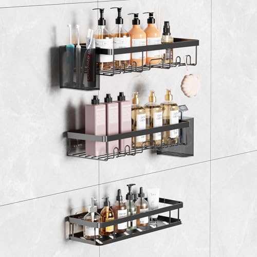 Étagère Douche sans Perçage, 5 Pièces Étagère Salle de Bain Antirouille, Rangement Salle de Bain et Cuisine avec Crochets, Étagère Murale Grande Capacité avec 2 Boîtes de Rangement Latérales - Noir
