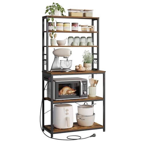 VASAGLE Étagère de Cuisine avec Multiprise, Étagère pour Machine à Café, 6 Étagères, 6 Crochets, pour Four à Micro-Ondes, Cadre en Acier, 40 x 80 x 167 cm, Marron Rustique et Noir d'encre KKS119K06