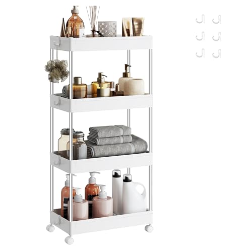 SONGMICS Chariot, Chariot de Cuisine à 4 Niveaux, Étagère de Cuisine, Étagère Étroite, avec 6 Crochets, Structure en Acier, Salle de Bain, 23,6 x 42 x 86 cm Blanc Nuage KSC10WT
