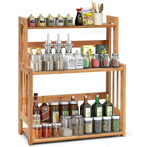 KOMFOTTEU Étagère à Épices en Bambou, Porte epices de Cuisine avec 1 Étagère réglable, Étagère de rangement, pour Cuisine, Salle à manger, Chambre, Bureau, 41,5 x 18 x 50 CM (L x l x H)