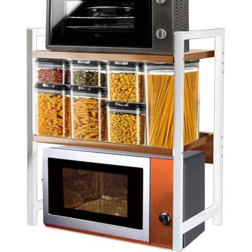 Shally Dogan Étagère à micro-ondes en acier, étagère de cuisine avec étagère à épices, unité d'étagères à 2 compartiments avec pieds antidérapants, design moderne (beige + blanc)