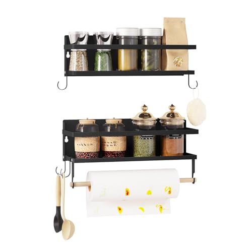 WOLTU Étagère Murale Cuisine, Étagère à Épices, Lot de 2, avec Porte-Serviettes, 4 Crochets Amovibles, en Métal, Noir