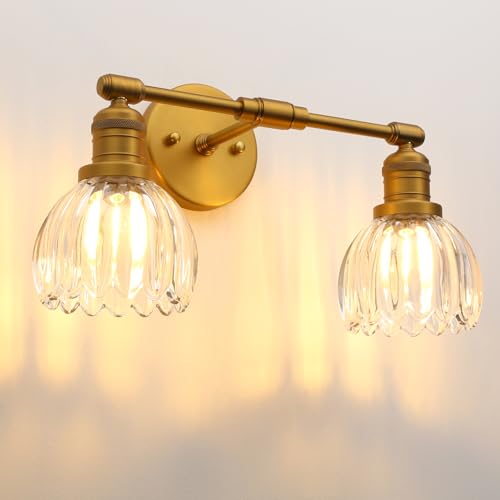Pathson 2-Lumière Applique Murale Intérieure, Abat-jour en Verre Tulipes Applique Salle de Bain Vintage E27 Luminaire pour Salon Chambre Cuisine (Laiton Antique)