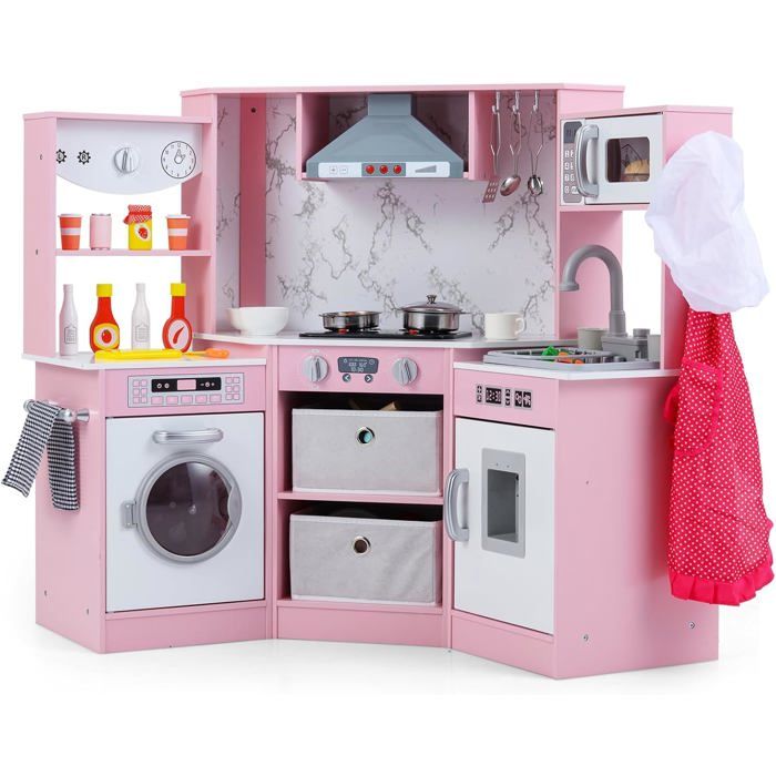 GOPLUS Cuisine dangle pour Enfant en Bois avec Lumières et Sons Réalistes Accessoires et Rangement pour 3+ Ans (Rose)