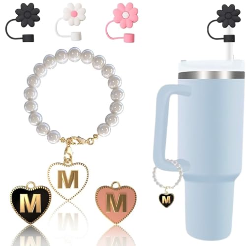 runrayay Stanley Cup Accessoires, 3 pièces en Forme de Fleur de 10 mm Chapeau de Paille et Une chaîne de Perles, avec 3 pièces d'initiales ID Lettres Charme Compatible avec 30 et 40 onces Stanley (M)