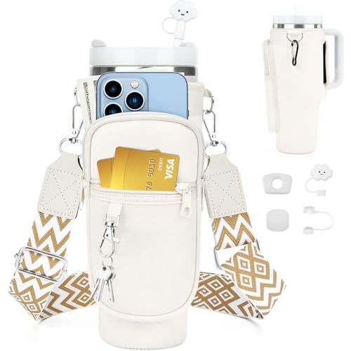 JAMSSOW Sac Bouteille d'eau pour Tasse Stanley Cup 40 oz, avec bandoulière réglable, Porte-clés, Poche pour téléphone Portable, Accessoires pour Voyage, Course à Pied, Cyclisme (Blanc crème)