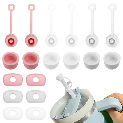 Lot de 18 Bouchons en Silicone Anti-Fuite pour Stanley Cup H1.0 H2.0 40oz/30oz + 6 Couvercles de Paille, 6 Bouchons Carrés et 6 Bouchons de Fuite Ronds (Translucide,Blanc,Rose)