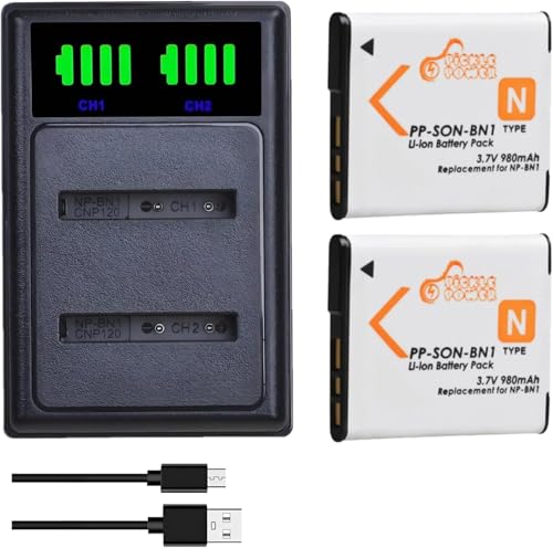 Pickle Power Lot de 2 batteries NP-BN1 et chargeur USB LCD pour Sony Cyber-Shot DSC-W800, DSC-WX220, DSC-W830, DSC-W810, Sony DSC-QX30, DSC-QX100, DSC-QX10