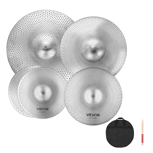 VEVOR Ensemble de Cymbales Batterie, Cymbale Charleston 355 mm, Crash 400 mm, Crash 455 mm, Ride 505 mm, avec Baguettes, Sac de Rangement, Lot de 4 Cymbales à Faible Volume, Couleur Argent Brillant