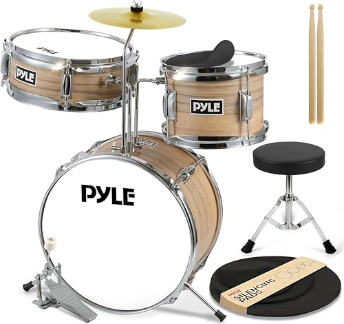 Pyle Set de Batterie Enfant – Kit de Batterie Musique Junior Débutant 3 Pièces avec Grosse Caisse de 33 cm, Caisse Claire, Tom, Cymbale, Siège Réglable, Sourdines, Baguettes, Naturel