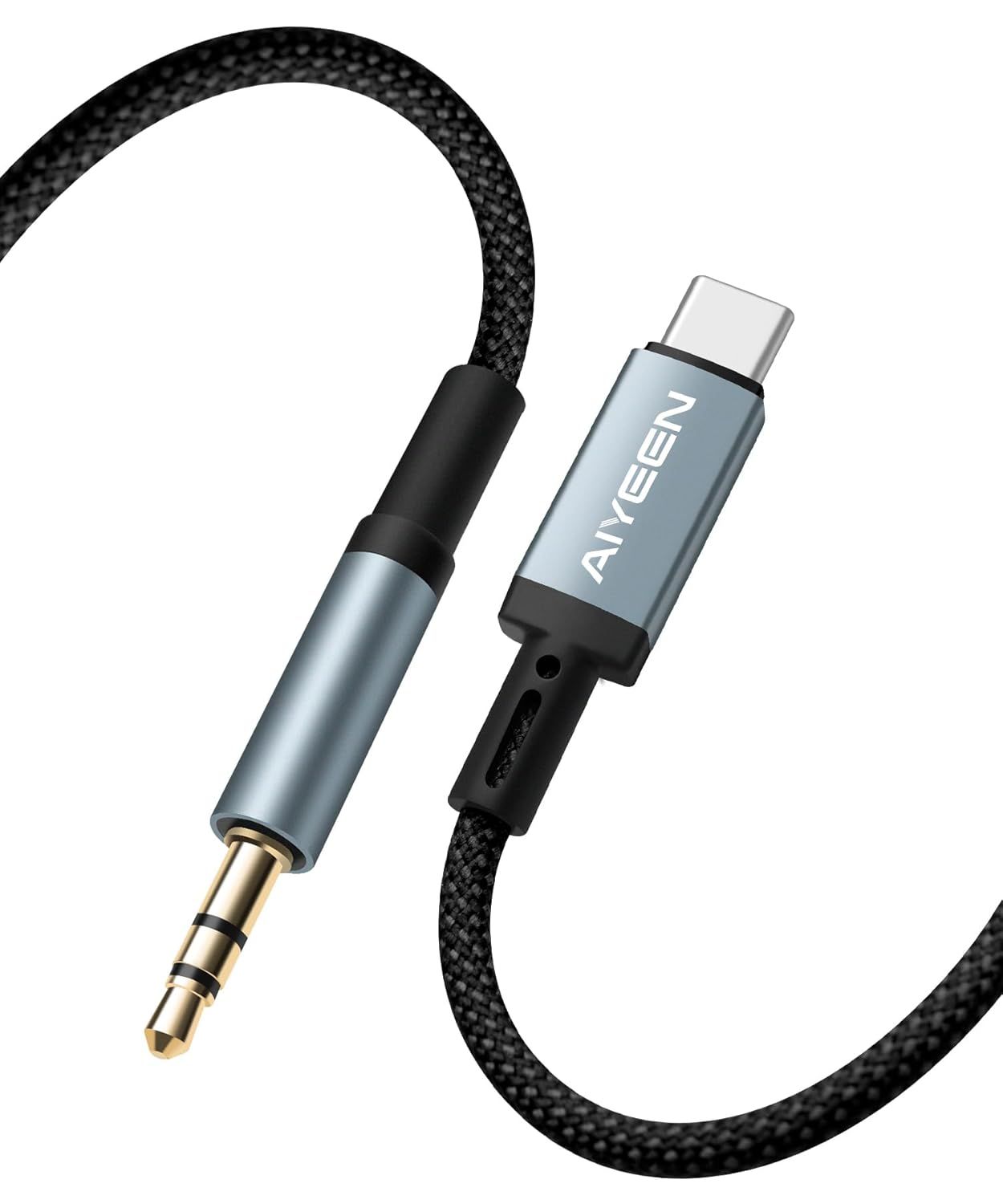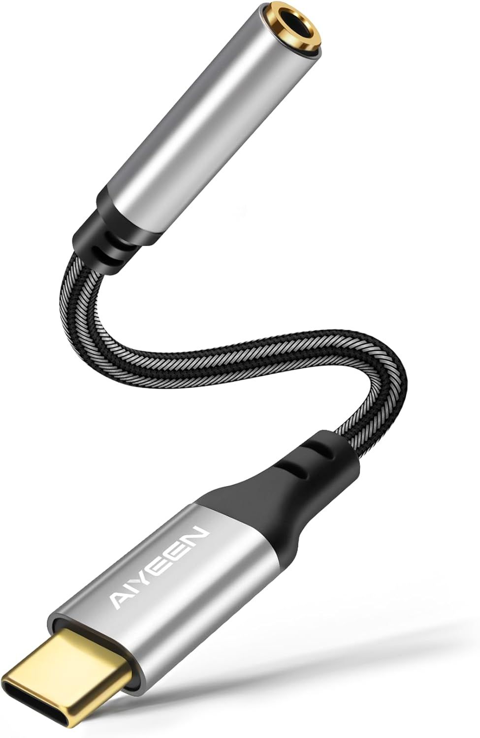 AIYEEN Adaptateur Casque Type-C vers 3,5 mm, câble convertisseur stéréo USB-C vers auxiliaire Silver avec Puce de Carte Son DAC Haute résolution, Nylon tressé, 13 cm – Argent