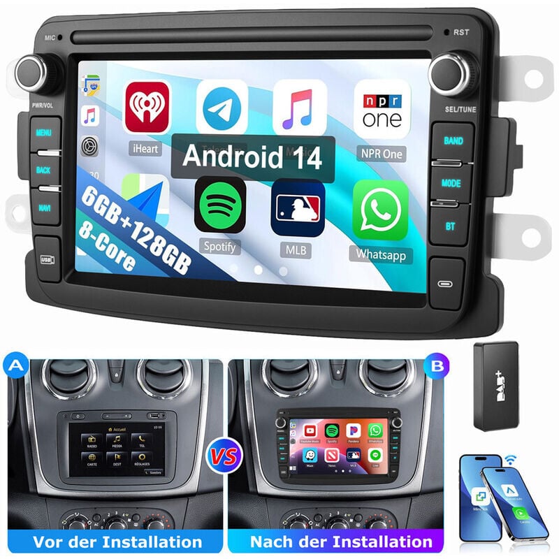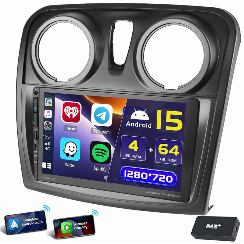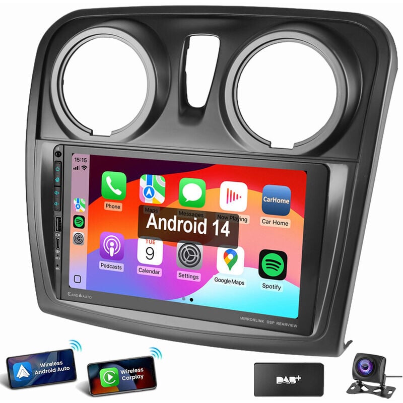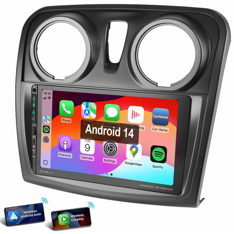 8" 8-Core 4Go+64Go Android 14 Autoradio CarPlay sans Fil pour Dacia Sandero Duster Logan Dokker Lodgy GPS Navigateur WiFi Bluetooth 5.1 Canbus SWC Écran Tactile Dab+Radio OBD2