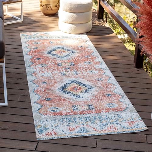 Surya Lusaka Tapis Exterieur Terrasse, Balcon, Véranda, Patio - Tapis de Couloir Géométrique Scandinave, Boheme Chic Oriental - Tapis Jardin Extérieur et Intérieur Moderne 80x220cm - Orange, Bleu