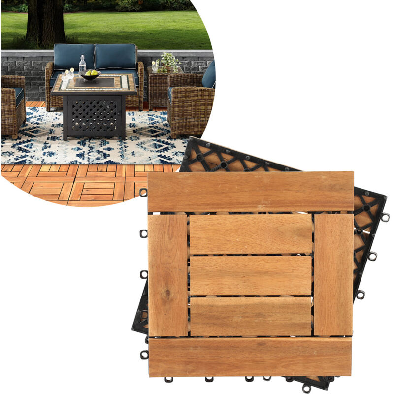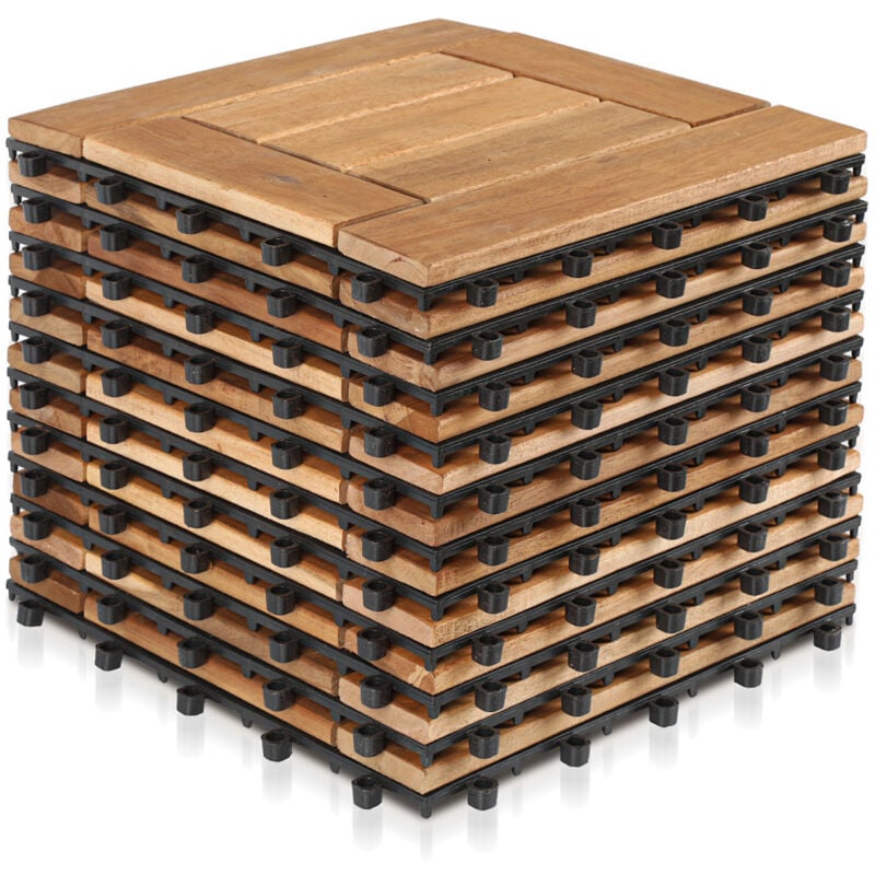 Lot de 10 dalles extérieures en bois d'acacia 30x30cm – Épaisseur 1,9cm – Système d'encliquetage pour montage rapide – Résistantes aux intempéries –