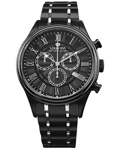 LOUIS XVI Danton 1504 – Montre pour homme – Étanche – Avec verre saphir – Bracelet bicolore noir argenté – Cadran noir – Mouvement à quartz suisse