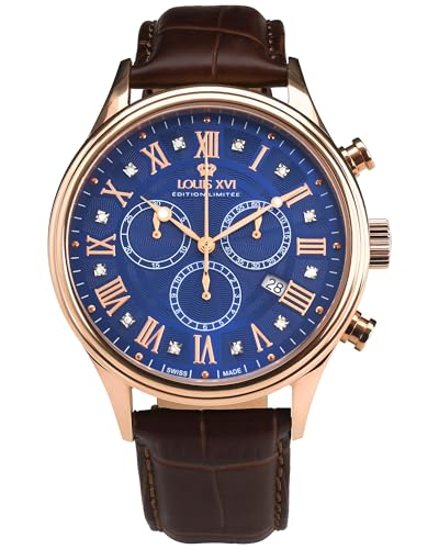 LOUIS XVI Danton 1502 Montre pour homme - Diamètre 44 mm - Étanche - Or rose avec verre saphir - Bracelet marron - Cadran bleu diamants - Mouvement à quartz suisse