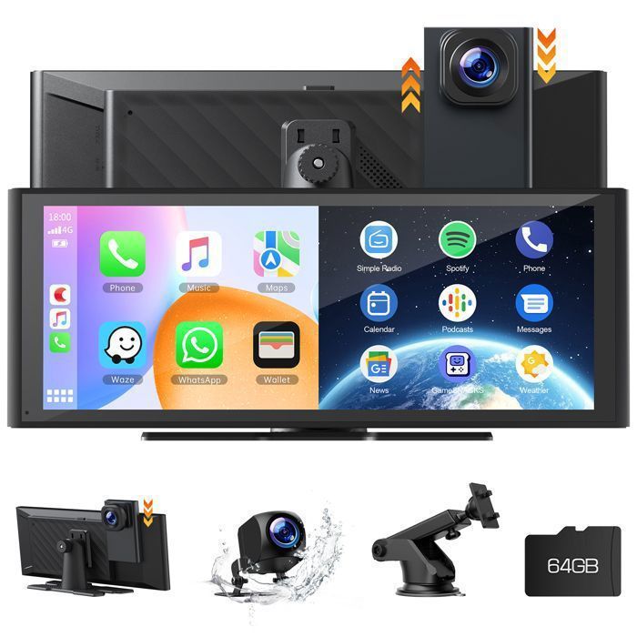 10,26 Pouces Autoradio Portable sans Fil CarPlay Android Auto Dashcam 4K Caméra Avant 1080P Caméra arrière Bluetooth WiFi Lien Miroir Carte TF 64 Go