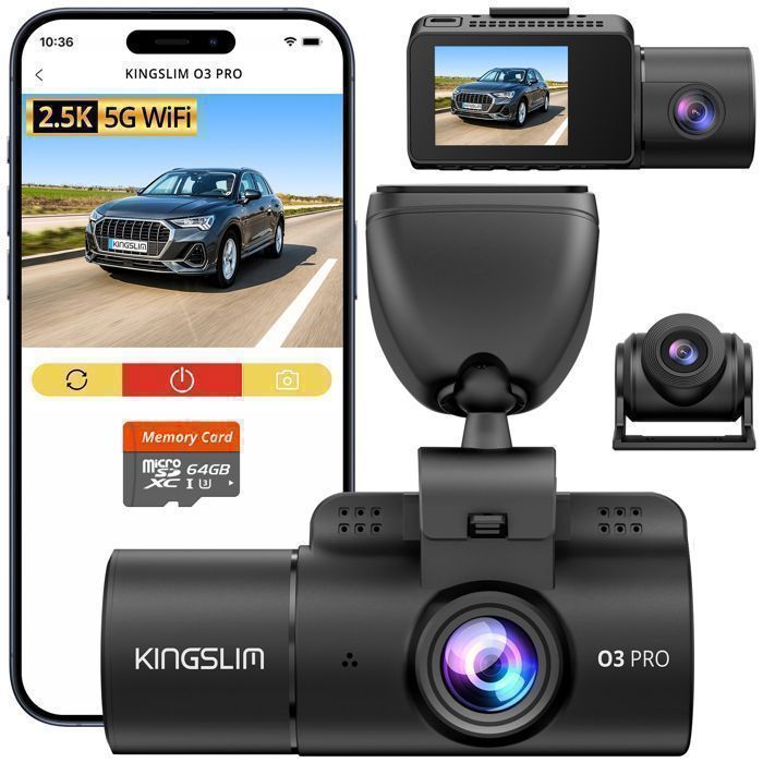 KINGSLIM DashCam Voiture 3 canaux 25k+2x1080P HDR O3pro Caméra de Voiture Avant Arriere 5G WiFi GPS avec carte 64 Go - Noir