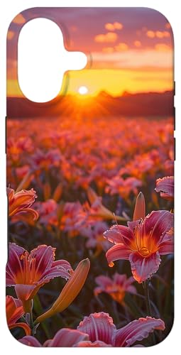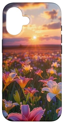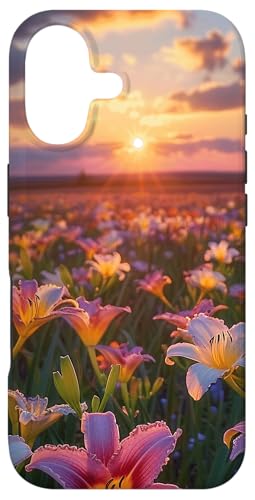 Beau Motif Coucher de Soleil sur Le Champ de Fleurs d'héméro Coque pour iPhone 16 Plus