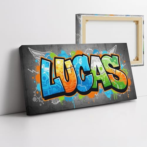 Toile personnalisée prénom graffiti bleu tag urbain tableau mural street art déco chambre enfant ou ado moderne cadeau personnalisé anniversaire naissance baptême Noël toile murale design prénom