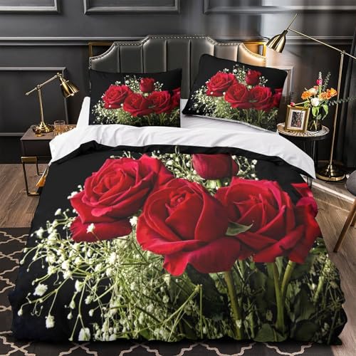YVASPQRTW Roses Rouges 3D Imprimé Drap de Couette Microfibre hypoallergénique Composition Florale Romantique Housse de Couette 2 taies Lavable Machine déco Chambre ado King(220x240cm)