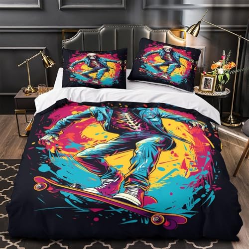YVASPQRTW Squelette de Skateur 3D Imprimé Drap de Couette Microfibre éclair dissimulé Style Graffiti Vibrant Housse de Couette 2 taies inaltérable déco Chambre ado Single(140x200cm)