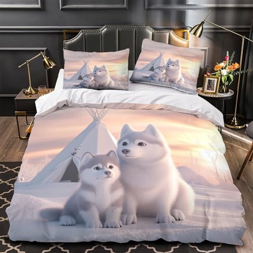 YVASPQRTW Husky de Sibérie 3D Imprimé Drap de Couette 3 pièces Microfibre Entretien Facile Dessin animé Mignon Housse de Couette 2 taies inaltérable déco Chambre ado King(220x240cm)