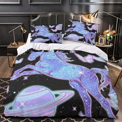 YVASPQRTW Fantaisie de Licorne 3D Imprimé Housse de Couette Microfibre Anti-Decoloration Néon Cosmique Drap de Couette 2 taies Respirant déco Chambre ado Super King(260x220cm)