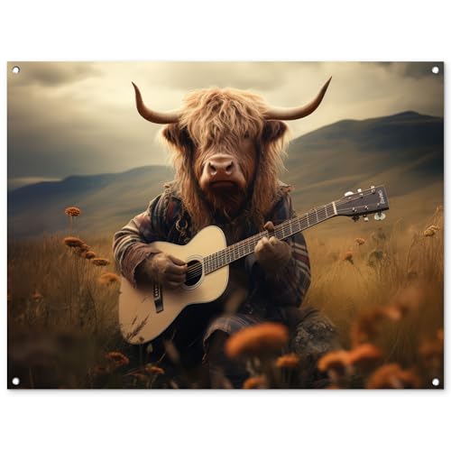 MuchoWow© Décoration Jardin 80x60 cm Bâche Décorative Posters Décoratifs Decoration Balcon Affiche Extérieur Déco Appartement Deco Exterieur Highlander écossais - Guitare - Fleurs - Montagnes
