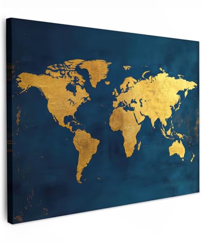 MuchoWow© Impressions sur Toile 120x80 cm Deco Tableau Murale Decoration Salon Peinture Tableaux Chambre Toiles Maison Carte du Monde - Or - Bleu Foncé