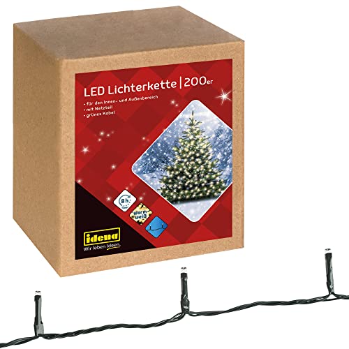 Idena 31869 - Guirlande lumineuse LED avec 200 LED en blanc chaud, avec fonction minuterie 8 heures et transformateur, longueur env. 29,9 m, intérieur et extérieur, pour fêtes, Noël, déco, mariage