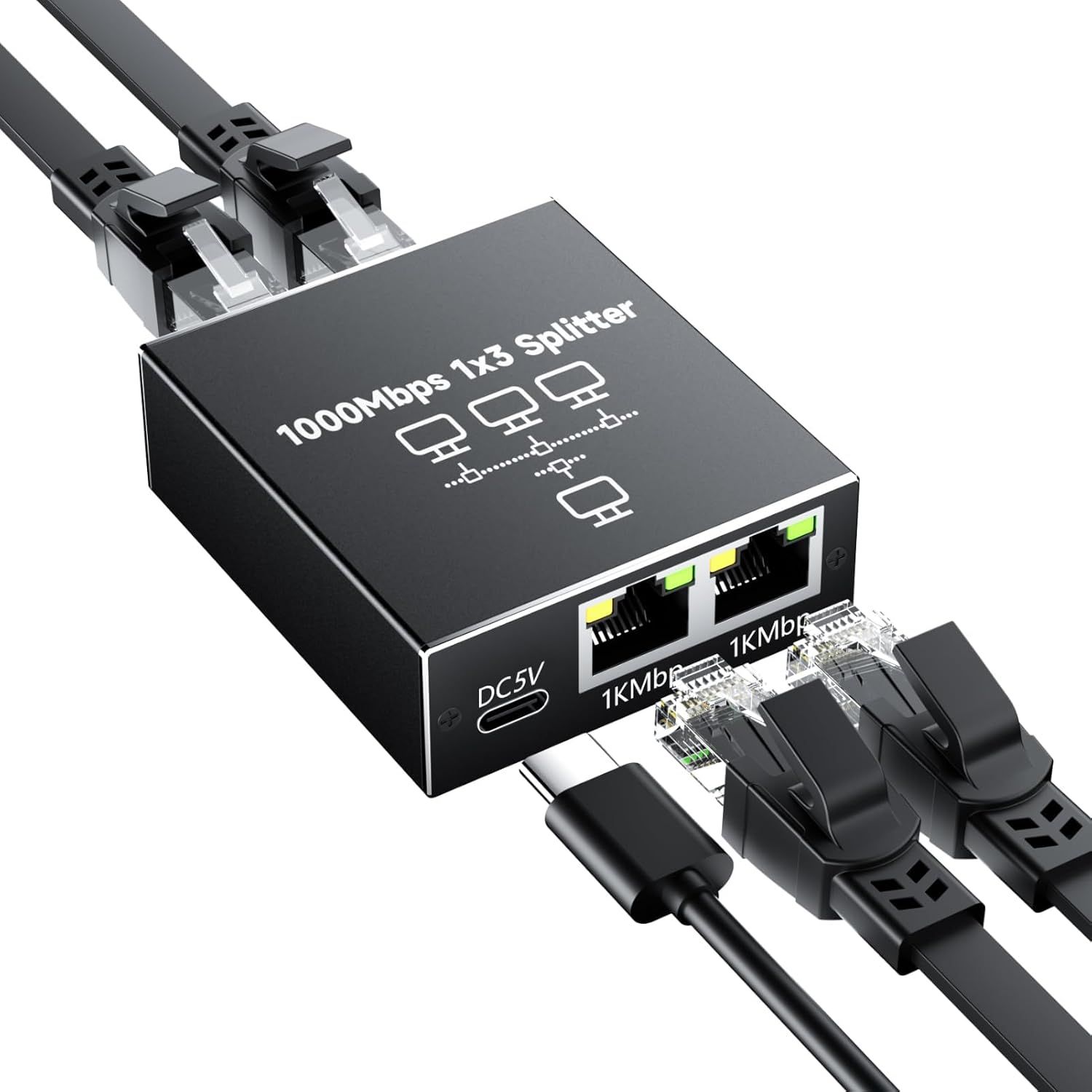 Répartiteur LAN 1 à 3 Répartiteur Ethernet 1000 Mbps Commutateur LAN 3 Ports avec Câble d'alimentation de Type-C Commutateur Gigabit pour Ordinateur, Hub, Commutateur, Routeur, Décodeur, Télévision