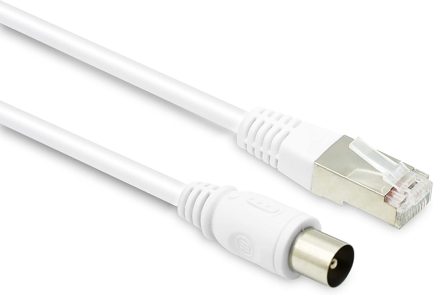 Câble RJ45/TV coaxial 9,52mm Prise Mâle/Male pour réception Television,TNT,Satellite,Décodeur,Antenne-Fil 5 mètres blindé à contact dorés-Blanc