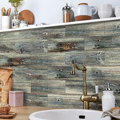 Credence Adhesive pour Cuisine Vintage Bleu Grain Bois Stickers Cuisine Imperméable Stickers Carrelage Décoration Maison Carrelage Adhesif Mural Salle de Bain pour Meubles 18 Pièces/10x30cm
