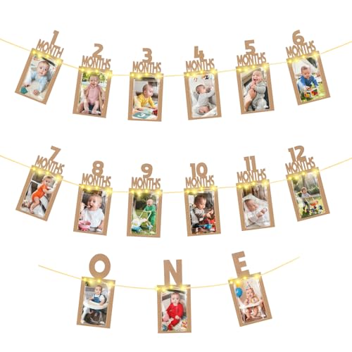 Seutgjie Decoration Anniversaire 1 An Garcon Fille avec Lumière LED Pochettes en OPP et 15 Cartes pour Photos de 1 à 12 Mois