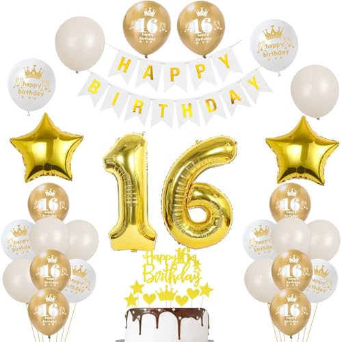 Or Décoration 16 ans fille anniversaire ballons 16 ans garcon, bannière Happy Birthday guirlande de fanions, décoration anniversaire 16 fille garcon ballon, déco de gâteau dorée 16
